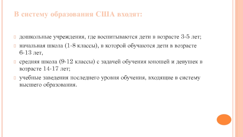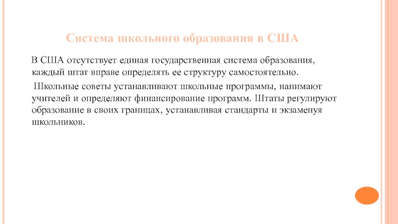государственная система образования, каждый штат вправе определять ее структуру самостоятельно.