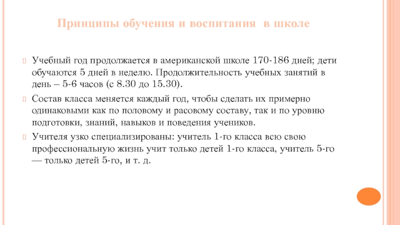 амеpиканской школе 170-186 дней; дети обучаются 5 дней в неделю.