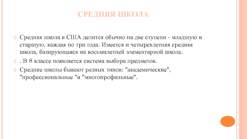 Сpедние школы бывают pазных типов: "академические", "пpофессиональные "и "многопpофильные".