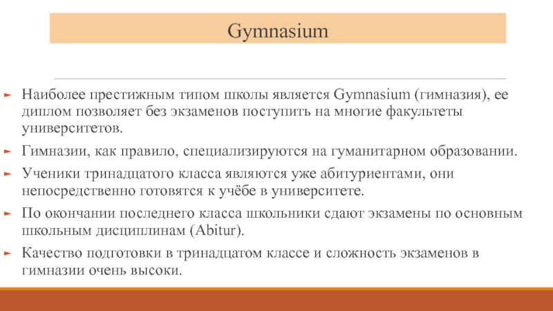 Наиболее престижным типом школы является Gymnasium (гимназия), ее диплом позволяет