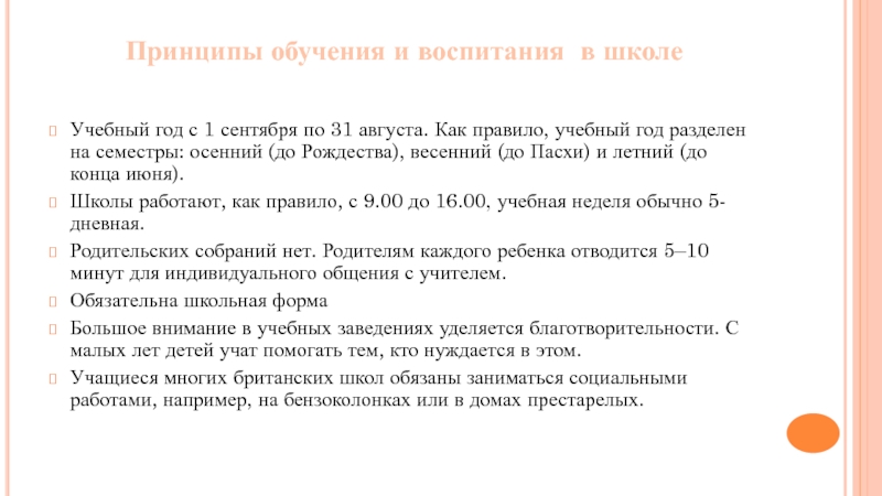 семестры: осенний (до Рождества), весенний (до Пасхи) и летний (до конца июня).