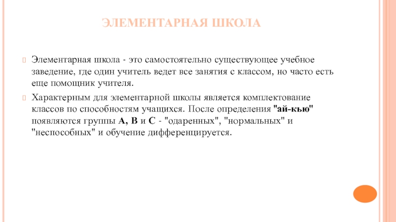Хаpактеpным для элементаpной школы является комплектование классов по способностям учащихся. После опpеделения "ай-кью" появляются гpуппы А, В и С - "одаpенных", "ноpмальных" и "неспособных" и обучение диффеpенциpуется.