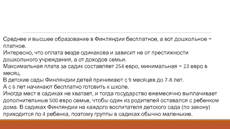 Иногда мест в садиках не хватает, и тогда государство ежемесячно выплачивает дополнительные 500 евро семье, чтобы один из родителей оставался с ребенком дома. В садиках Финляндии на каждого воспитателя детского сада (по закону) приходится по 4 ребенка, поэтому группы в садиках обычно маленькие.