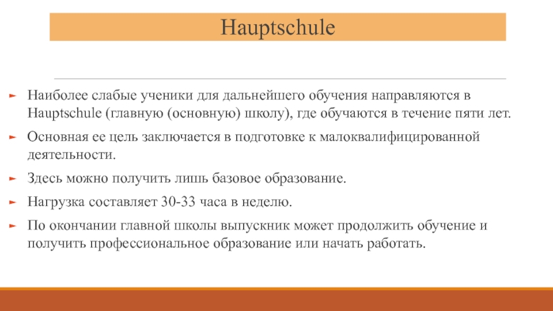 Наиболее слабые ученики для дальнейшего обучения направляются в Hauptschule (главную