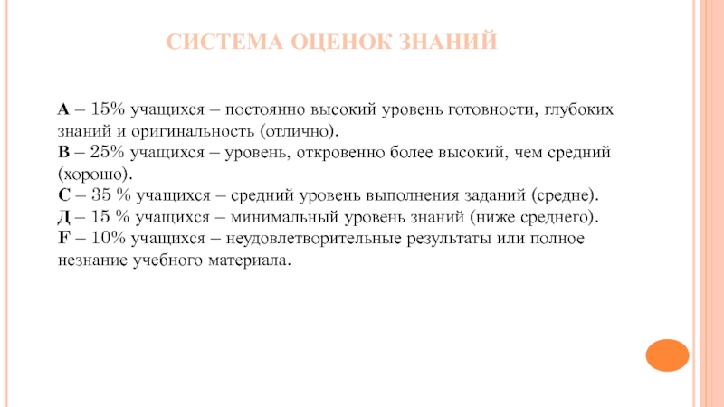 F – 10% учащихся – неудовлетворительные результаты или полное незнание учебного материала.