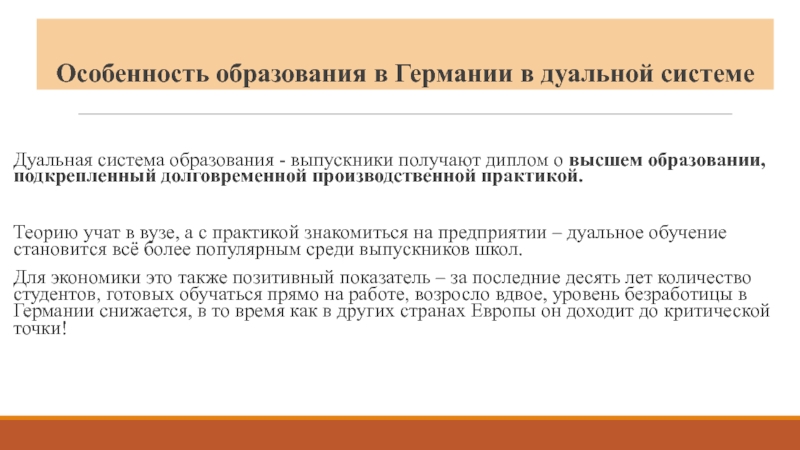 Для экономики это также позитивный показатель – за последние десять лет количество студентов, готовых обучаться прямо на работе, возросло вдвое, уровень безработицы в Германии снижается, в то время как в других странах Европы он доходит до критической точки!