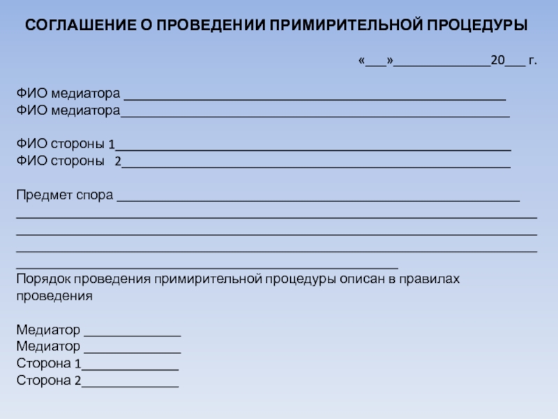 Слайд 19СОГЛАШЕНИЕ О ПРОВЕДЕНИИ ПРИМИРИТЕЛЬНОЙ ПРОЦЕДУРЫ