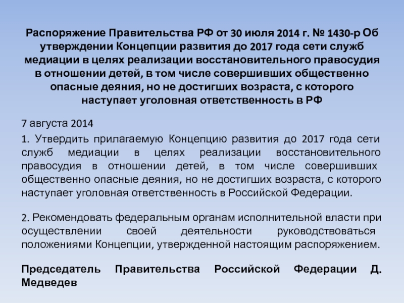 1. Утвердить прилагаемую Концепцию развития до 2017 года сети служб медиации в целях реализации восстановительного правосудия в отношении детей, в том числе совершивших общественно опасные деяния, но не достигших возраста, с которого наступает уголовная ответственность в Российской Федерации.