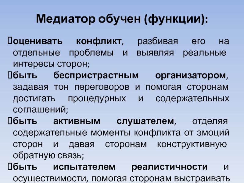 быть активным слушателем, отделяя содержательные моменты конфликта от эмоций сторон и давая сторонам конструктивную обратную связь;