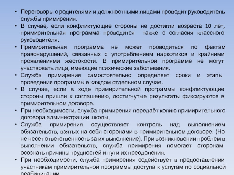 службы, так и обязательное согласие сторон, вовлеченных в конфликт, на участие в примирительной программе.