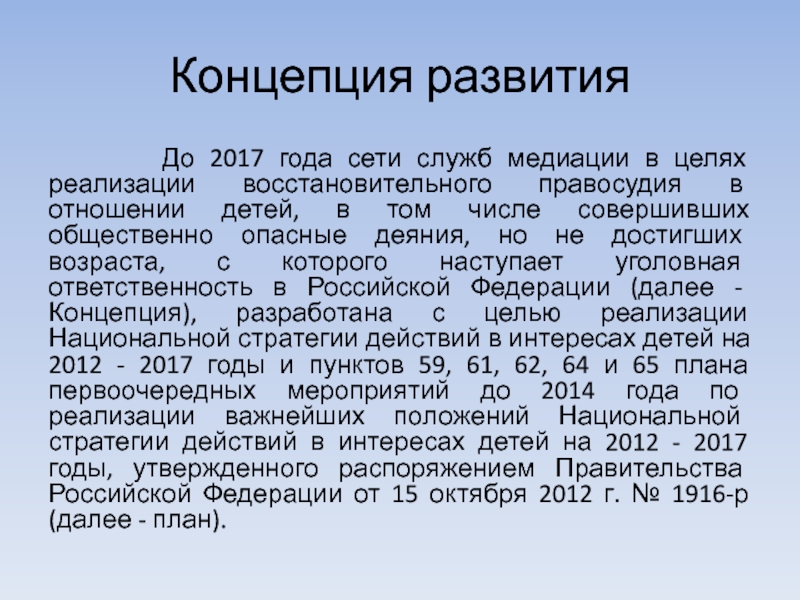 том числе совершивших общественно опасные деяния, но не достигших возраста, с которого наступает уголовная ответственность в Российской Федерации (далее - Концепция), разработана с целью реализации Национальной стратегии действий в интересах детей на 2012 - 2017 годы и пунктов 59, 61, 62, 64 и 65 плана первоочередных мероприятий до 2014 года по реализации важнейших положений Национальной стратегии действий в интересах детей на 2012 - 2017 годы, утвержденного распоряжением Правительства Российской Федерации от 15 октября 2012 г. № 1916-р (далее - план).