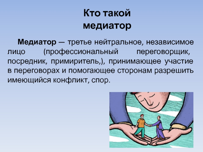 Слайд 3 Медиатор — третье нейтральное, независимое лицо (профессиональный переговорщик, посредник, примиритель,), принимающее