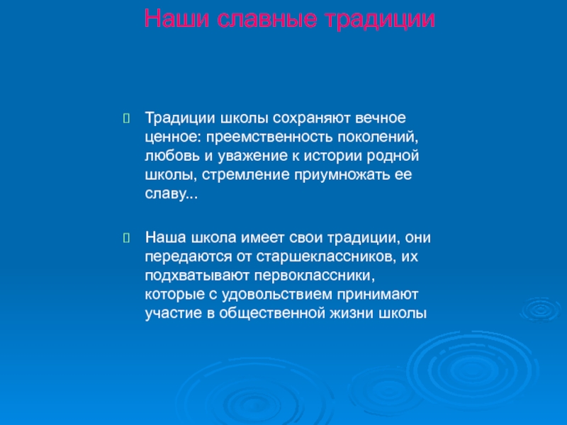 Наша школа имеет свои традиции, они передаются от старшеклассников, их подхватывают первоклассники, которые с удовольствием принимают участие в общественной жизни школы