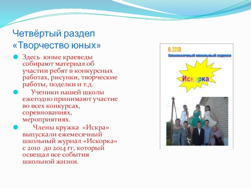 Этот раздел интересен тем, что в нём сохраняются работы юных художников, поэтов, мастеров.