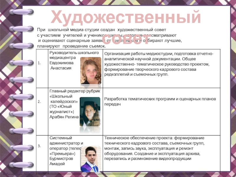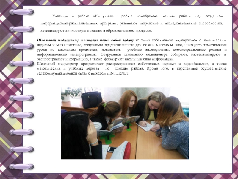 в образовательном процессе.Школьный медиацентр поставил перед собой задачу готовить собственные видеоролики к тематическим неделям и мероприятиям, специально предназначенные для показа в актовом зале, проводить тематические уроки по школьным предметам, показывать учебные видеофильмы, демонстрационные ролики и информационные телепрограммы. Сотрудники школьного медиацентра собирают, систематизируют и распространяют информацию, а также формируют школьный банк информации.
