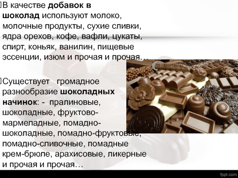 Существует громадное разнообразие шоколадных начинок: - пралиновые, шоколадные, фруктово-мармеладные, помадно-шоколадные, помадно-фруктовые, помадно-сливочные, помадные крем-брюле, арахисовые, ликерные и прочая и прочая…