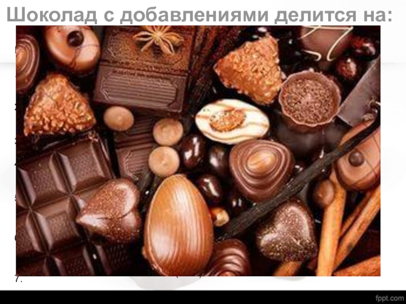 Слайд 7В качестве добавок в шоколад используют молоко, молочные продукты, сухие сливки, ядра орехов,
