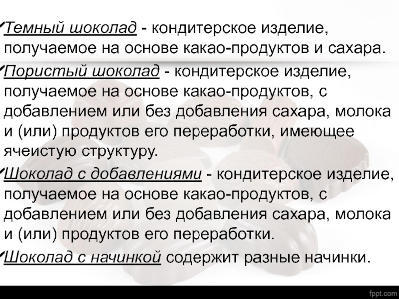Слайд 12Темный шоколад - кондитерское изделие, получаемое на основе какао-продуктов и сахара.