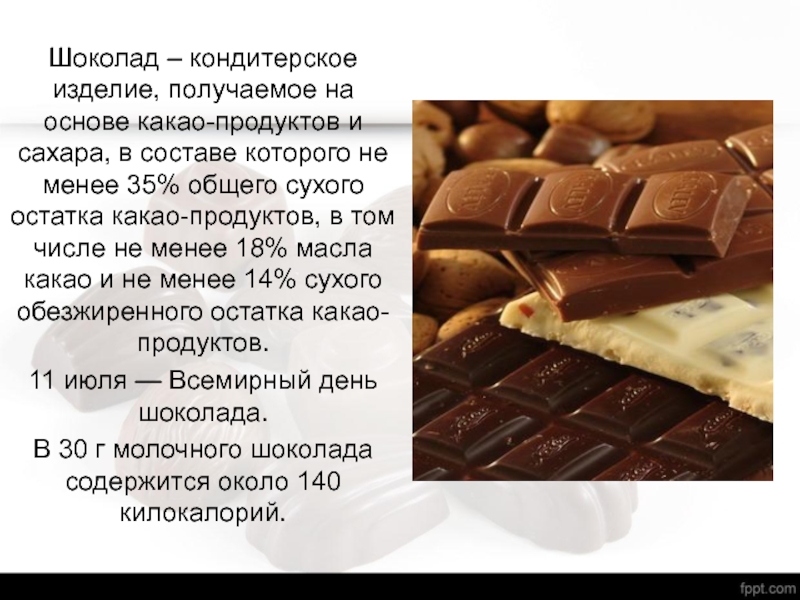 Слайд 2Шоколад – кондитерское изделие, получаемое на основе какао-продуктов и сахара,