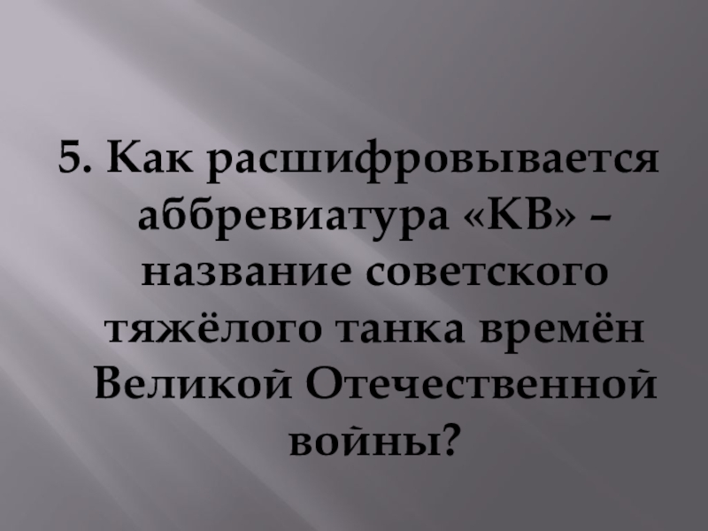 Слайд 65. Как расшифровывается аббревиатура «КВ» – название советского тяжёлого танка