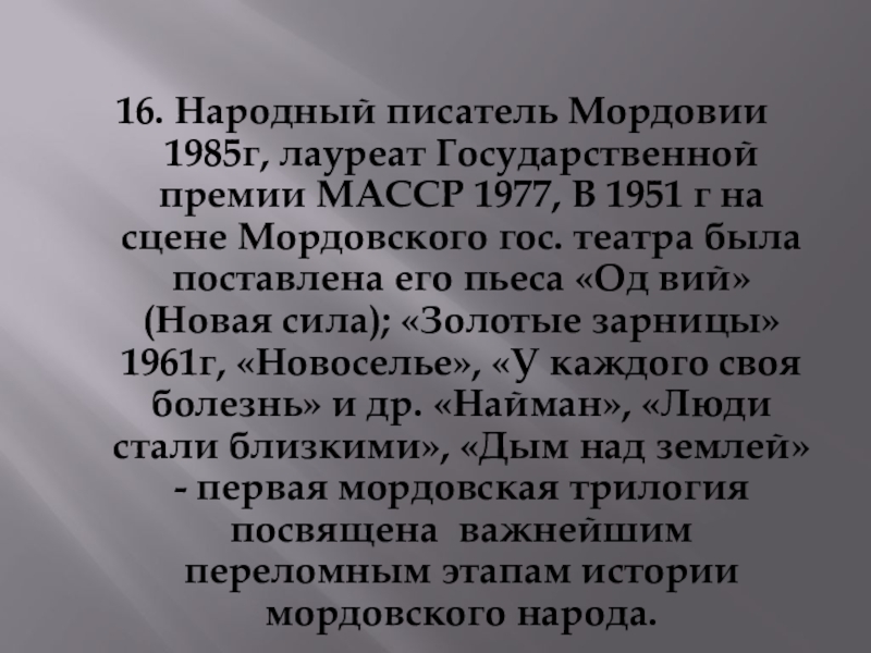Слайд 1716. Народный писатель Мордовии 1985г, лауреат Государственной премии МАССР 1977,