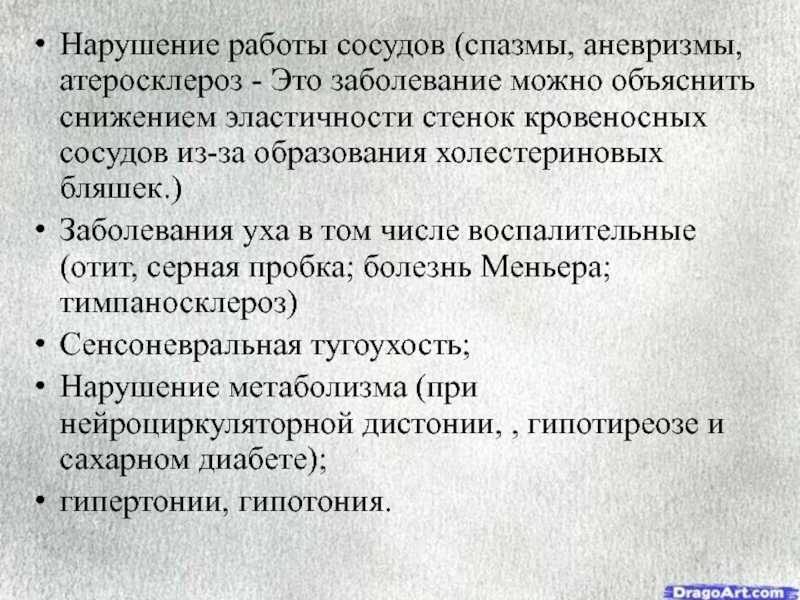 Нарушение работы сосудов (спазмы, аневризмы, атеросклероз - Это заболевание можно объяснить снижением эластичности стенок кровеносных сосудов из-за