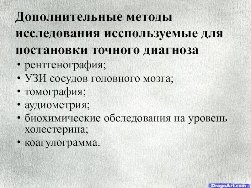 Дополнительные методы исследования исспользуемые для постановки точного диагноза рентгенография;УЗИ сосудов головного мозга;томография;аудиометрия;биохимические обследования на уровень холестерина;коагулограмма.