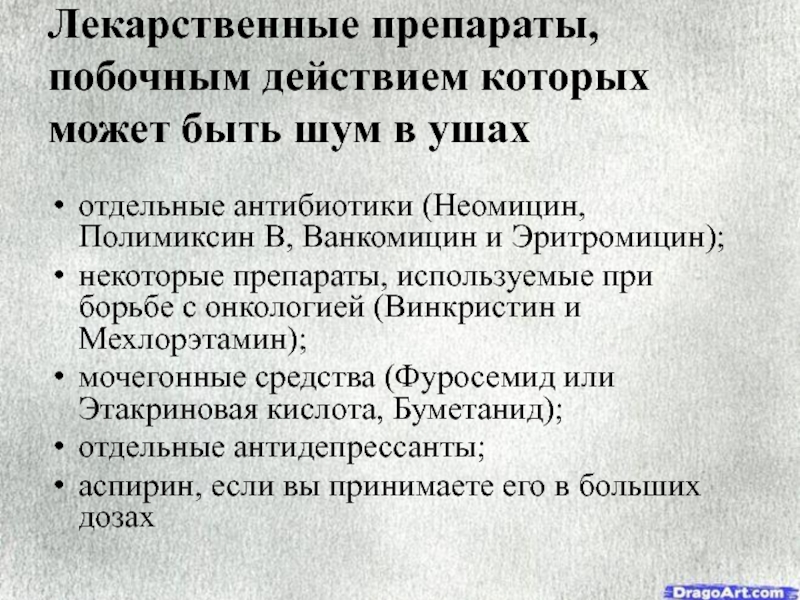 Слайд 7Лекарственные препараты, побочным действием которых может быть шум в ушах