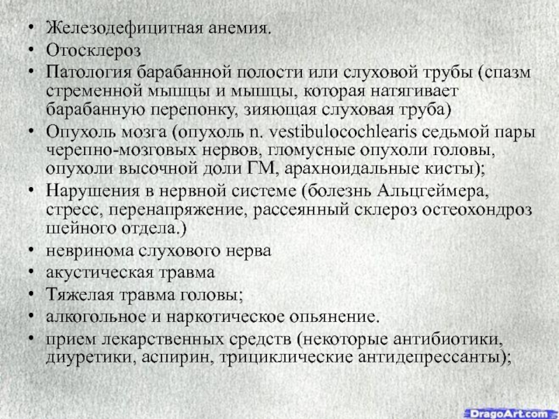 Железодефицитная анемия. Отосклероз Патология барабанной полости или слуховой трубы (спазм стременной мышцы и мышцы, которая натягивает барабанную