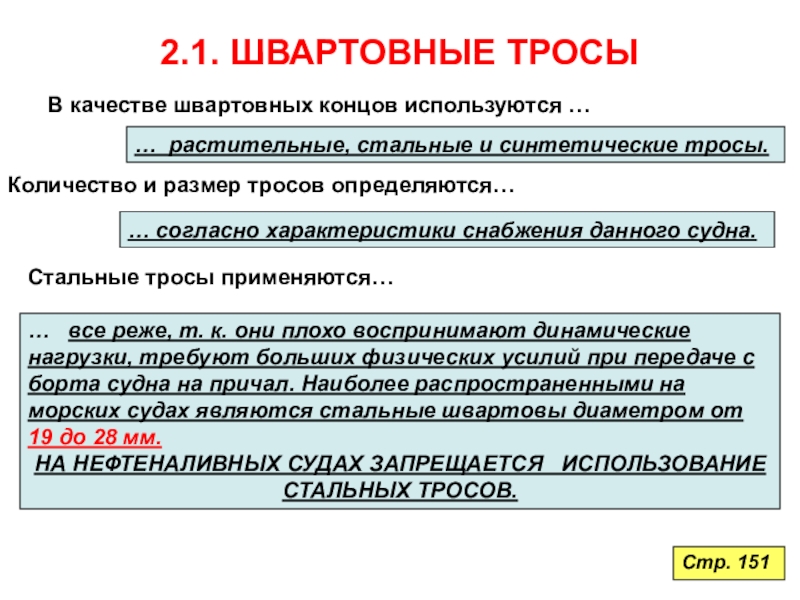 … все реже, т. к. они плохо воспринимают динамические нагрузки, требуют больших физических усилий при передаче с борта судна на причал. Наиболее распространенными на морских судах являются стальные швартовы диаметром от 19 до 28 мм.