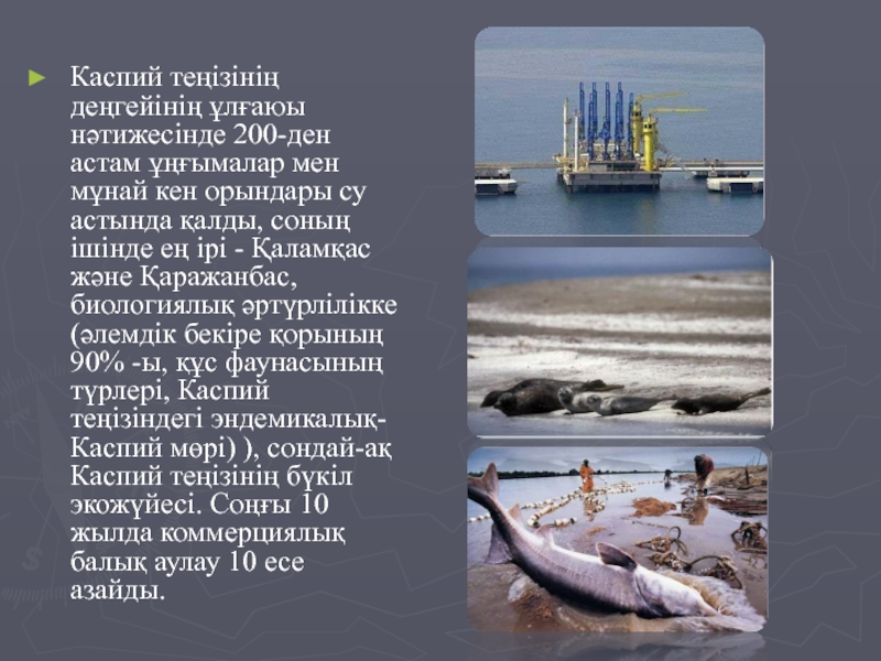 Слайд 14Каспий теңізінің деңгейінің ұлғаюы нәтижесінде 200-ден астам ұңғымалар мен мұнай