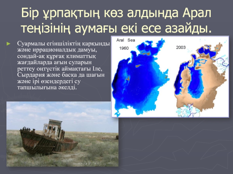 Слайд 5Бір ұрпақтың көз алдында Арал теңізінің аумағы екі есе азайды.