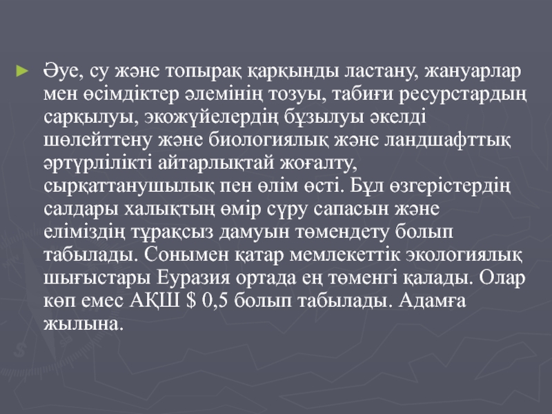 Слайд 16Әуе, су және топырақ қарқынды ластану, жануарлар мен өсімдіктер әлемінің