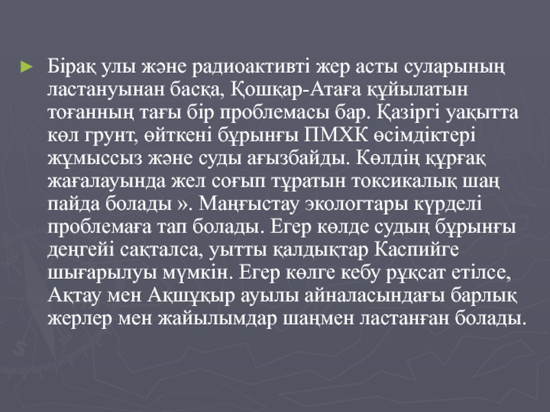 Слайд 11Бірақ улы және радиоактивті жер асты суларының ластануынан басқа, Қошқар-Атаға