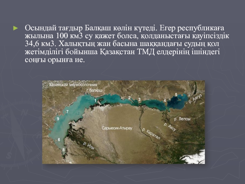 Слайд 6Осындай тағдыр Балқаш көлін күтеді. Егер республикаға жылына 100 км3