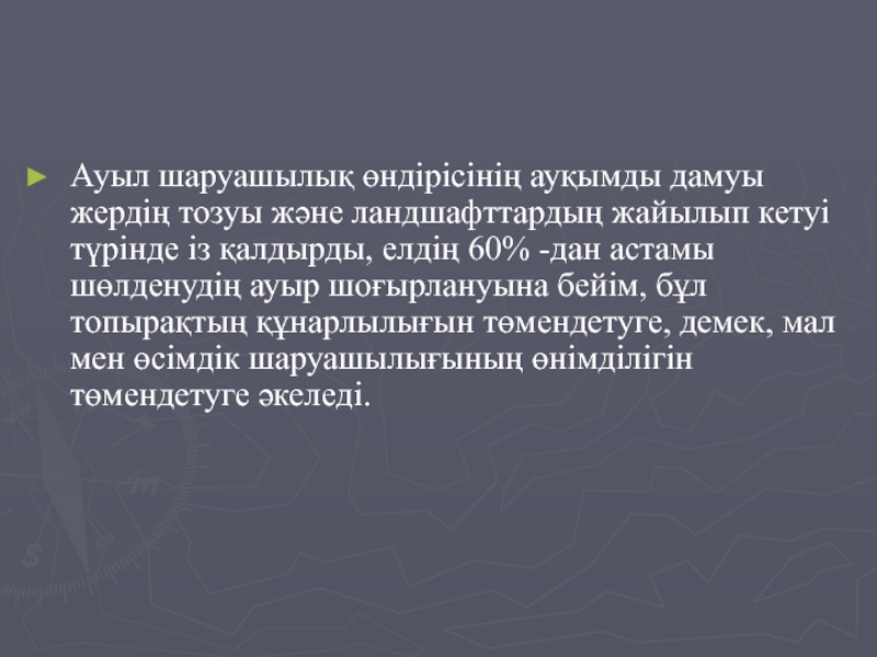 Слайд 3Ауыл шаруашылық өндірісінің ауқымды дамуы жердің тозуы және ландшафттардың жайылып
