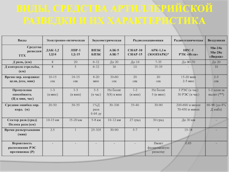 Слайд 30ВИДЫ, СРЕДСТВА АРТИЛЛЕРИЙСКОЙ РАЗВЕДКИ И ИХ ХАРАКТЕРИСТИКА