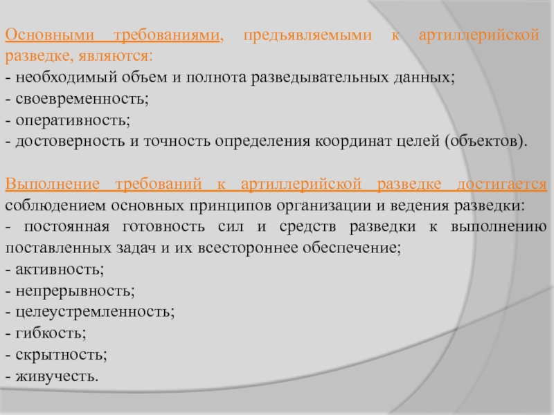Слайд 12Основными требованиями, предъявляемыми к артиллерийской разведке, являются: