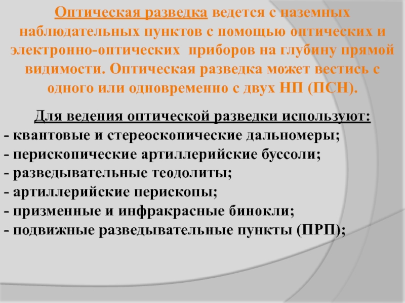 и электронно-оптических приборов на глубину прямой видимости. Оптическая разведка может