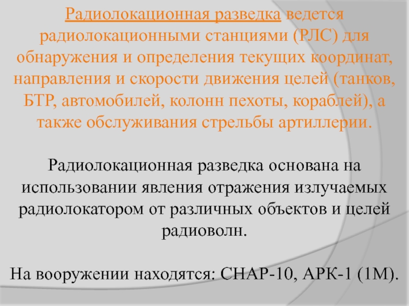 Слайд 19Радиолокационная разведка ведется радиолокационными станциями (РЛС) для обнаружения и определения