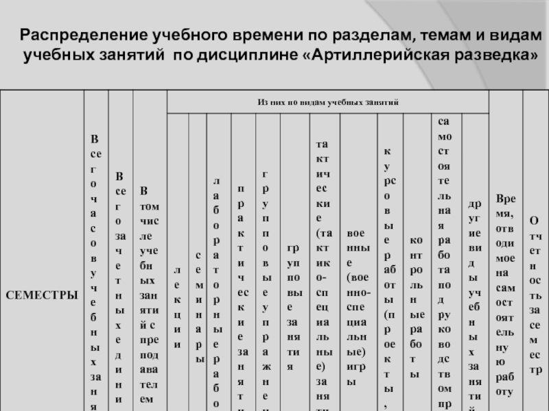 Слайд 7Распределение учебного времени по разделам, темам и видам учебных занятий