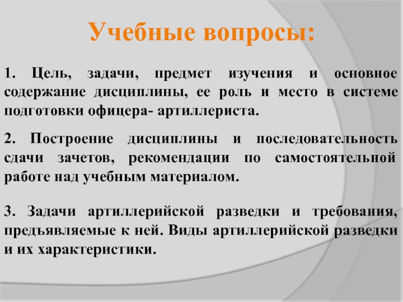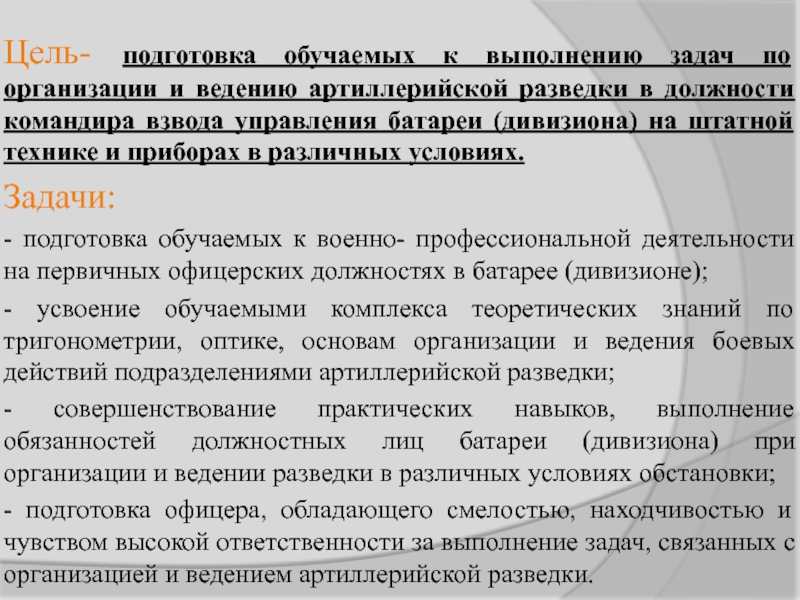 - усвоение обучаемыми комплекса теоретических знаний по тригонометрии, оптике, основам организации и ведения боевых действий подразделениями артиллерийской разведки;