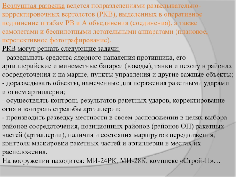 Слайд 24Воздушная разведка ведется подразделениями разведывательно-корректировочных вертолетов (РКВ), выделенных в оперативное