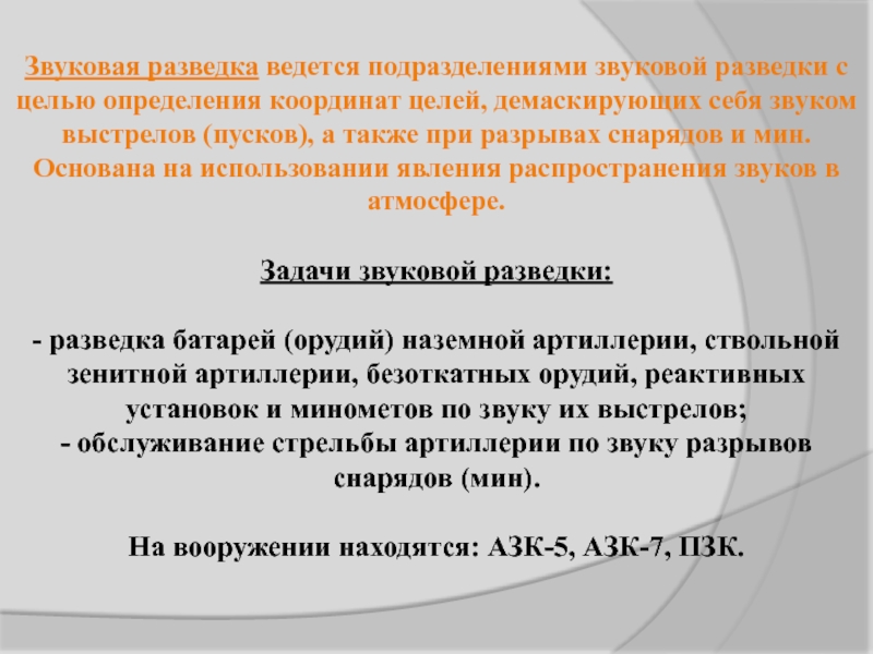 Слайд 16Звуковая разведка ведется подразделениями звуковой разведки с целью определения координат