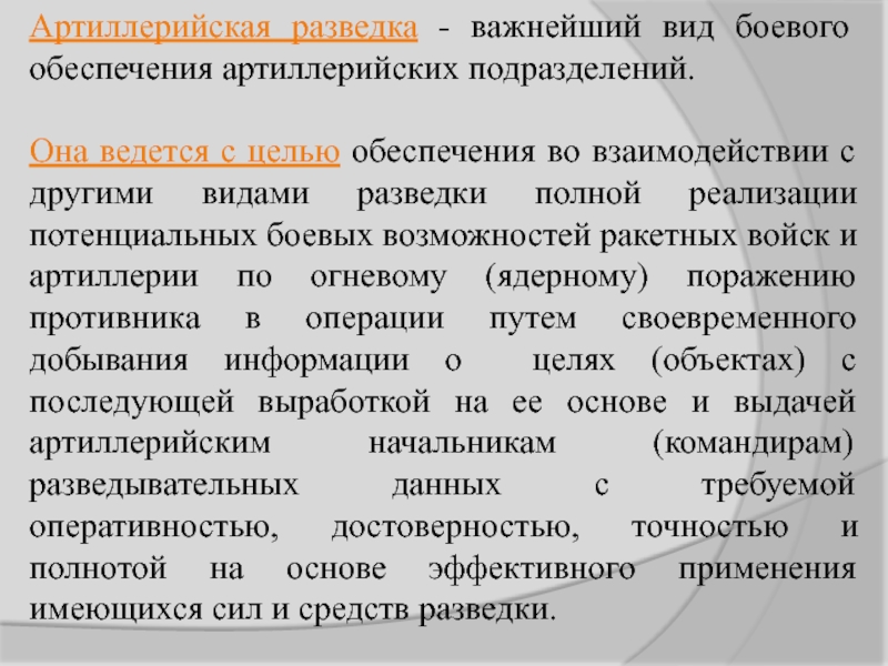 Слайд 10Артиллерийская разведка - важнейший вид боевого обеспечения артиллерийских подразделений.