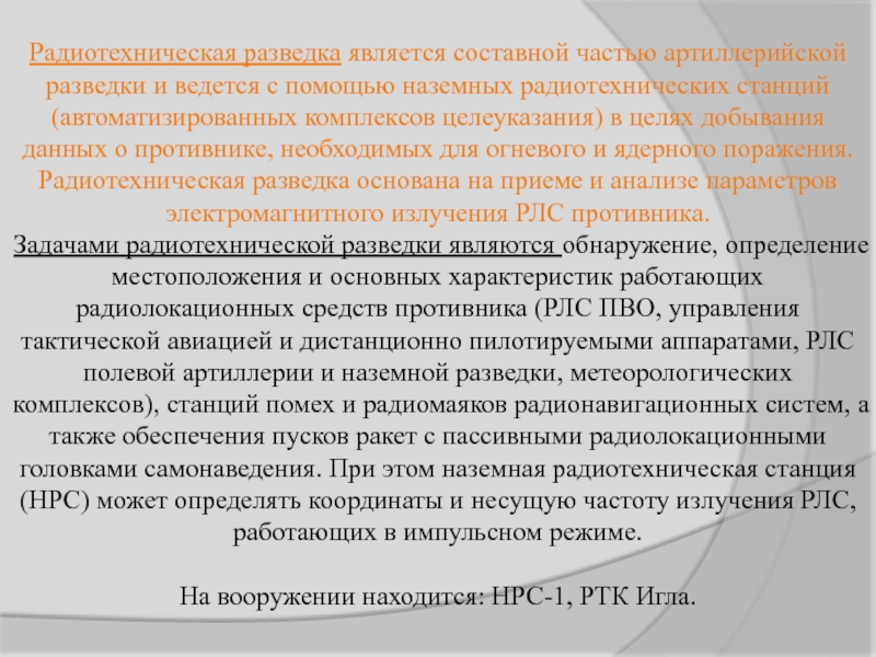 Радиотехническая разведка является составной частью артиллерийской разведки и ведется с