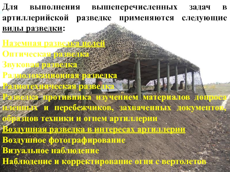 Слайд 13Для выполнения вышеперечисленных задач в артиллерийской разведке применяются следующие виды