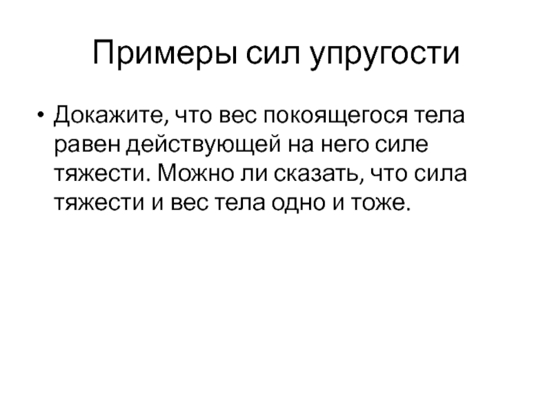 Примеры сил упругостиДокажите, что вес покоящегося тела равен действующей на него силе тяжести. Можно ли сказать, что