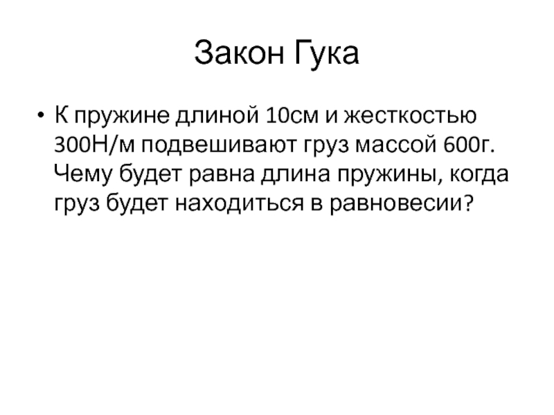 Закон ГукаК пружине длиной 10см и жесткостью 300Н/м подвешивают груз массой 600г. Чему будет равна длина пружины,