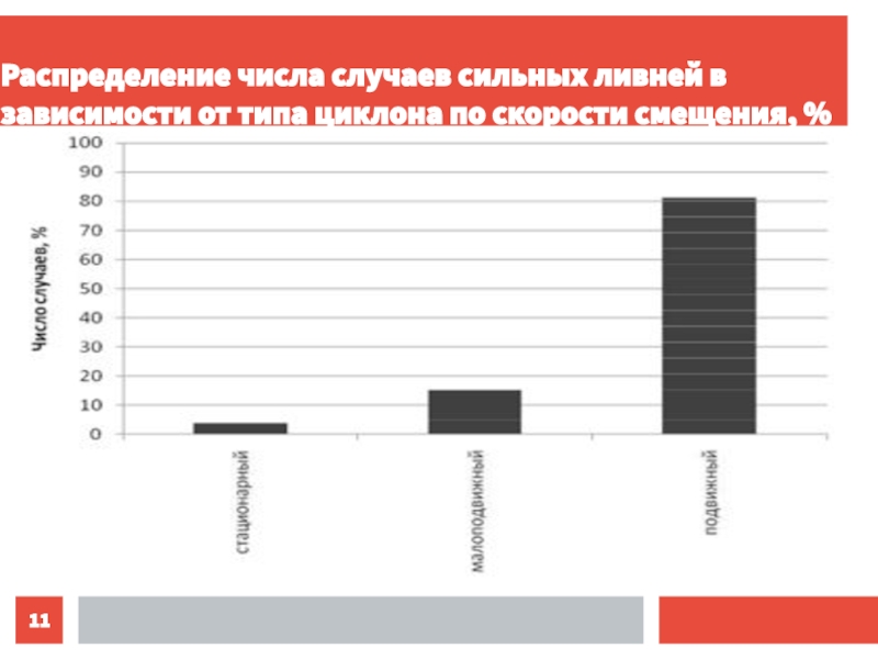 Слайд 11Распределение числа случаев сильных ливней в зависимости от типа циклона